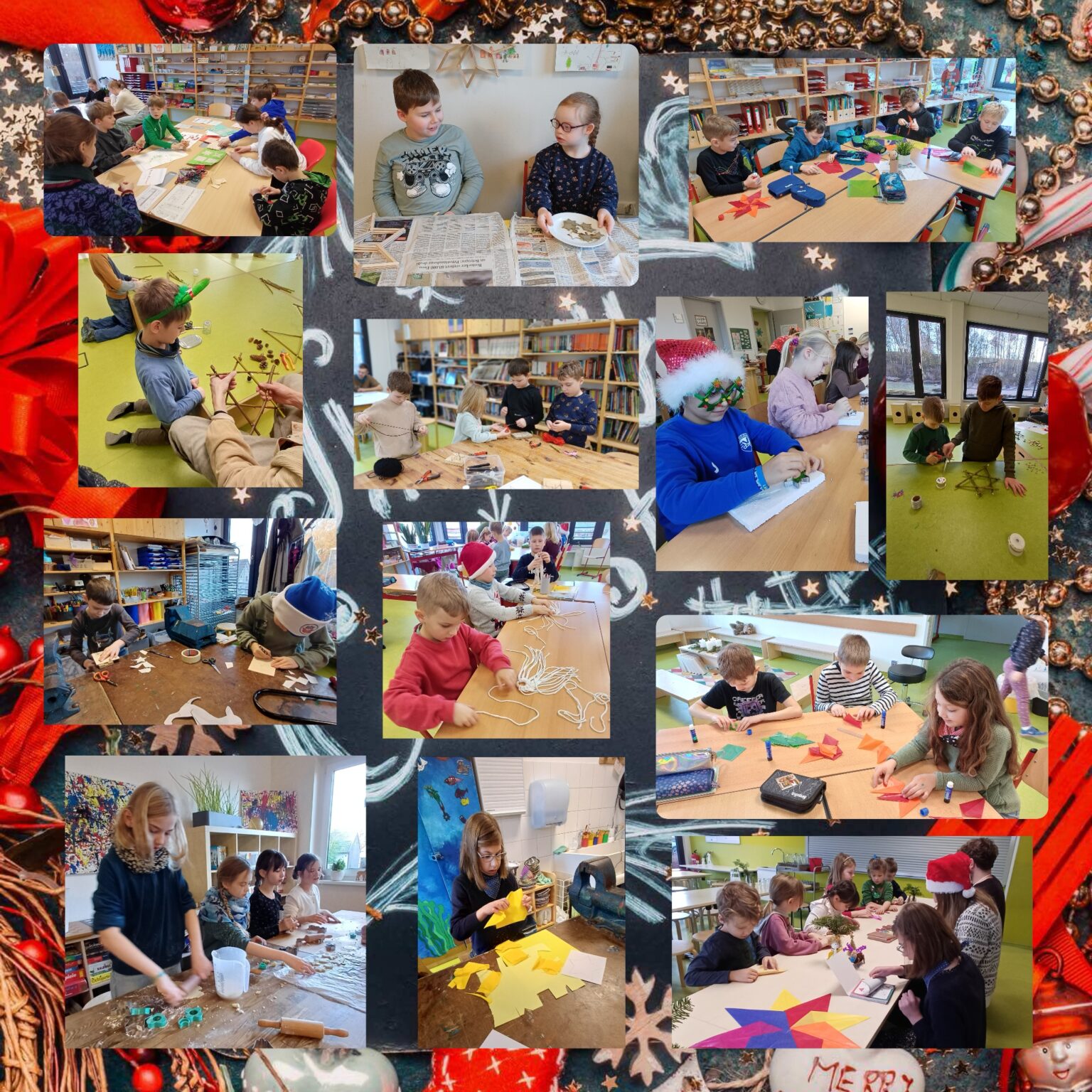 In diesem Schuljahr drehte sich alles um das Thema Sterne. Unsere Kinder durften sich in neun verschiedene Gruppen einwählen, um gemeinsam künstlerisch sowie handwerklich tätig zu werden. Es wurde gesägt, gehämmert, geklebt, gefalten, gebacken, gemalt und weihnachtlicher Musik gelauscht.